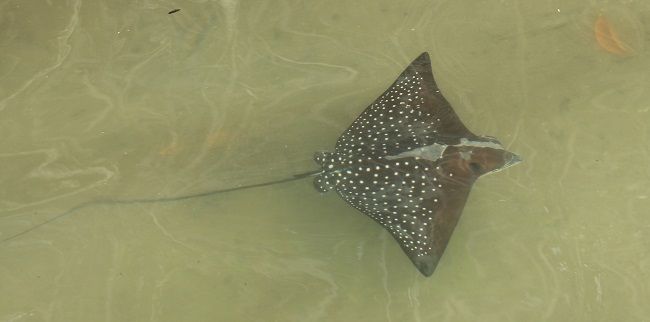 Tiefer in der Bucht wechselten wir vom Motorantrieb zu Paddeln und drangen weiter vor. Und wurden mal wieder reichlich belohnt, erst zeigten sich kaum Tiere und dann sahen wir immer wieder große Meeresschildkröten. Auch Haie und Gefleckte Adlerrochen gesellten sich dazu.