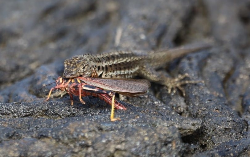 Auch hier hatten wir Glück und eine schwarze Lavaechse zeigte sich uns. Auch mitsamt Heuschreckenbeute. Die Echsen lassen die erbeuteten toten Heuschrecken zuerst in der Sonne trocknen, um dann einfacher die Flügel abbrechen zu können.