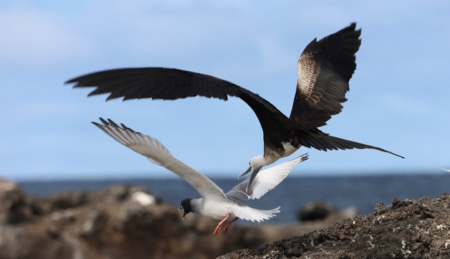 Die riesigen Fregattvögel, mit einer Flügelspannweite von bis zu 2,30 Metern beindrucken uns schon seit unserer Ankunft auf Galapagos. Ihre Flügelform erinnert ein wenig an Fledermäuse. Die Weibchen haben eine weiße Brust, die Männchen eine rote, die sie zur Balz wie einen Ballon aufblasen können. Hier können wir sie mit ihren Jungen und bei der Jagd beobachten. Um an Futter zu kommen, packen sie andere Vögel am Federkleid und schütteln diese, bis sie ihr Futter hervorwürgen. Eine sehr beeindruckende Technik. Die Fregattvögel können auch selber Fische jagen, die direkt an der Oberfläche schwimmen. Tauchen können sie jedoch nicht.