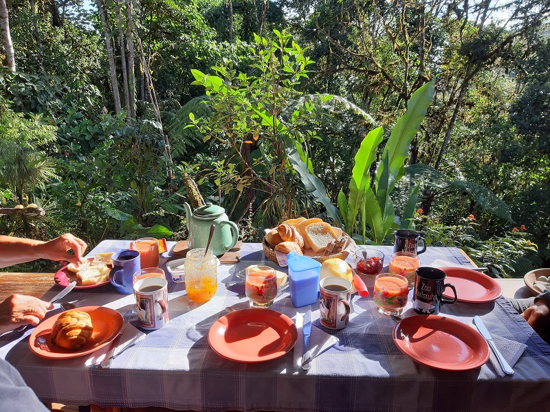Am nächsten Morgen ist der erste Blick aus dem Fenster sehr verheißungsvoll. Vom Bett aus blicken wir in dichten Bergnebelwald und direkt vor dem Fenster schwirren Kolibris umher.