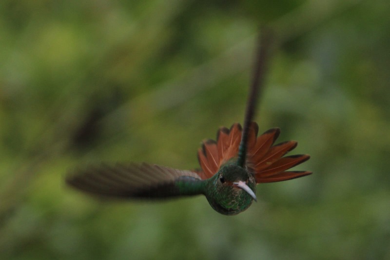 Ihr Flug hört sich an wie kleine Minihubschrauber und der Wind den Ihre schnell schlagenden Flügel erzeugen ist deutlich an der Hand zu spüren. Dieser Wind erzeugende Flügelschlag dient in Regionen, in denen es kaum Wind gibt, manchen Pflanzen sogar zur Bestäubung.